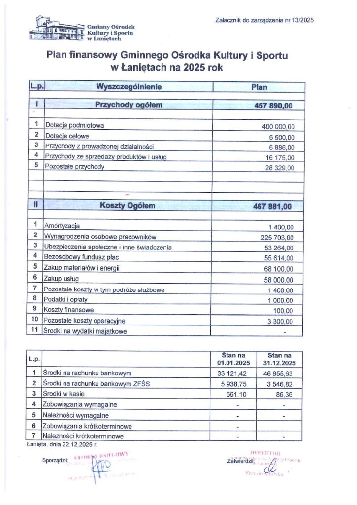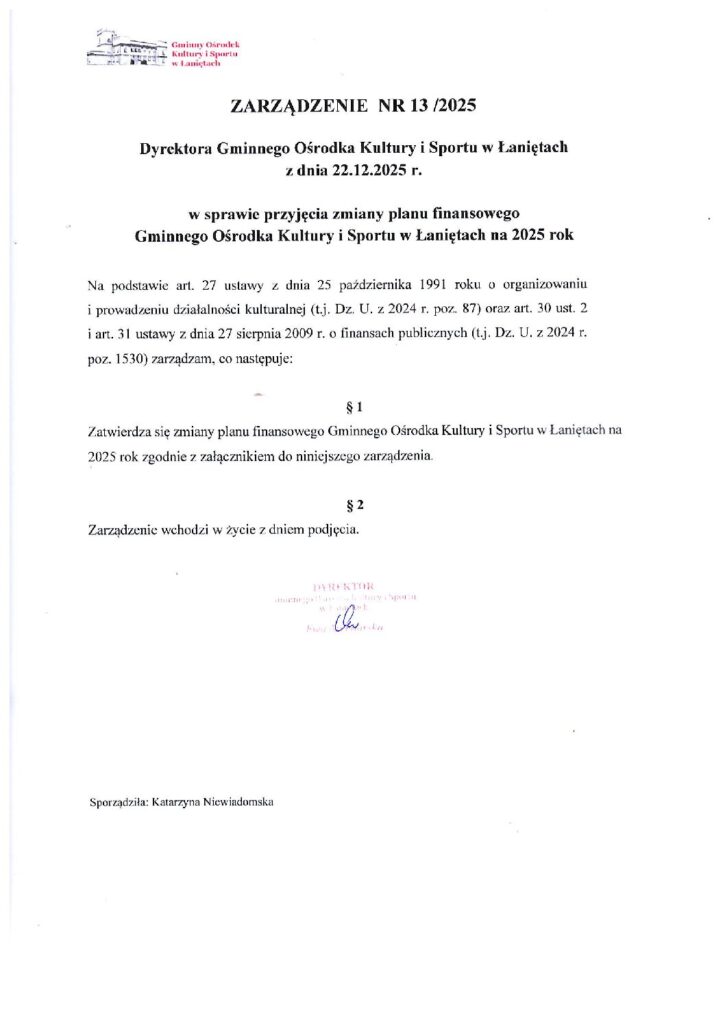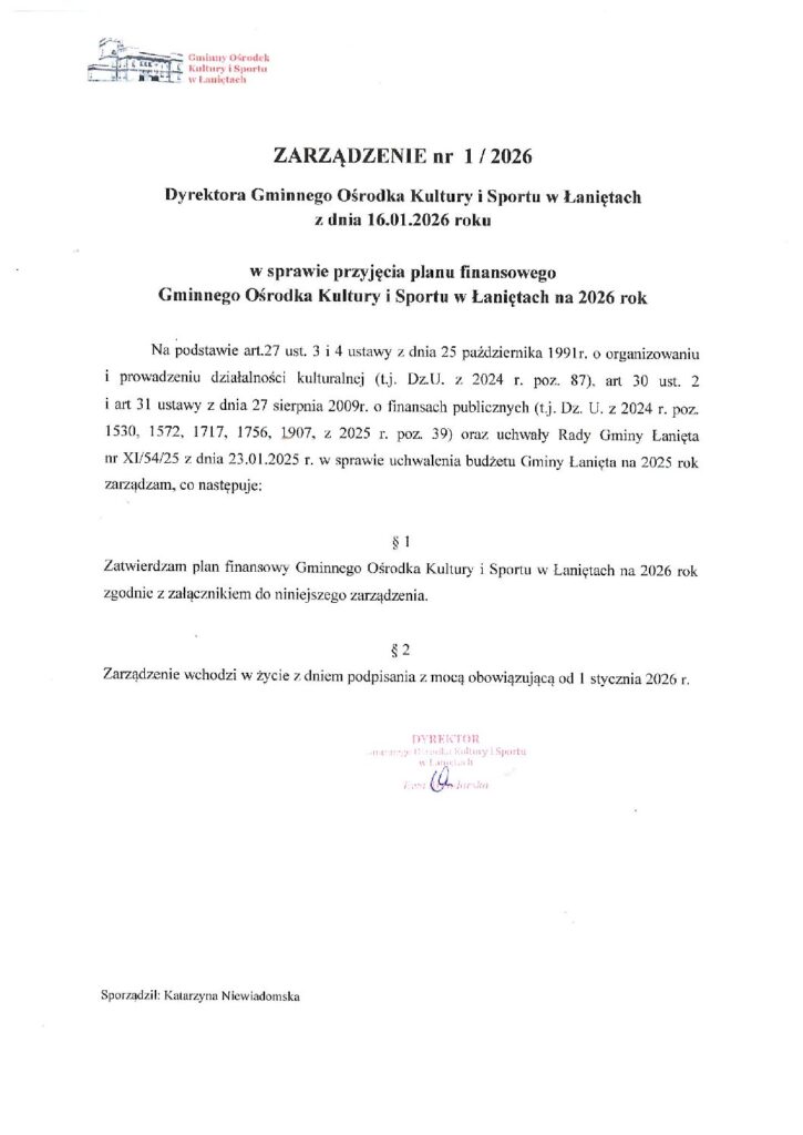 Zarządzenie 1/2026 z dnia 16.01.2026 r. w sprawie przyjęcia planu finansowego GOKiS w Łaniętach lut 6, 2026 | Bez kategorii, Zarządzenia
