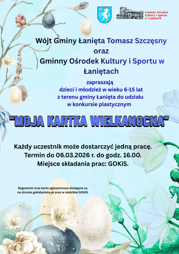 Wójt Gminy Łanięta Tomasz Szczęsny oraz Gminny Ośrodek Kultury i Sportu w Łaniętach zachęca dzieci i młodzież w wieku 6–15 lat z terenu Gminy Łanięta do wykonania własnej, wyjątkowej kartki wielkanocnej.